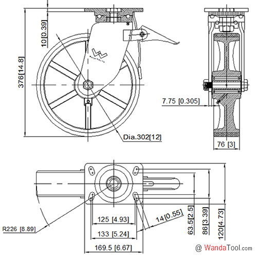 ? 裝配12×3英寸鐵芯聚氨酯輪,超級聚氨酯輪面更耐磨,耐負(fù)載。輪轂處安裝注油杯易于保養(yǎng)。