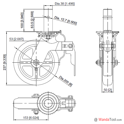 | 8”×2” 200×50mm | 9.33" 237mm | 660lbs 300kg | ?1.36" ?34.5mm | 4" 100mm | 2.08" 53mm | 鐵芯橡膠輪 | SCAFA-200050R-12 |